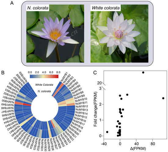 The expression levels of the R2R3-MYB gene in N. colorata and White colorata in petals. (A) Representative images of N. colorata and White colorata. Images were from PCBB. (B) Expression levels of R2R3-MYB genes in N. colorata and White colorata in petals. (C) Scatter plot of the expression levels of R2R3-MYB gene. The expression level of the MYB genes in N. colorata was denoted as FPKM (N. colorata). Similarly, the expression level of the MYB genes in White colorata was denoted as FPKM (White colorata). The x-axis shows the difference in the expression level of the R2R3-MYB gene between N. colorata and White colorata, and the difference was calculated as ΔFPKM = FPKM (N. colorata) – FPKM (White colorata). The y-axis shows the fold change of the expression level of R2R3-MYB gene between N. colorata and White colorata. The fold change was calculated using the formula: Fold Change (FPKM) = FPKM (N. colorata)/FPKM (White colorata).