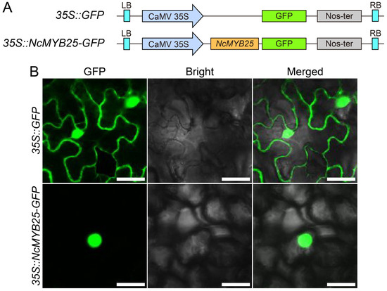Subcellular localization was analyzed using the tobacco transient transformation system [65,66]. The coding sequence (CDS) of the NcMYB25 gene was cloned into the pCAMBIA1305-GFP vector to create the pCAMBIA1305-NcMYB25-GFP construct. This construct, along with the pCAMBIA1305-GFP vector, was transformed into Agrobacterium tumefaciens GV3101 separately. The Agrobacterium solution carrying the constructs was injected into the leaves of tobacco seedlings, and the plants were incubated under weak light for one day, then under normal conditions for 1–2 days. The fluorescence signal of GFP proteins and NcMYB25-GFP fusion proteins in tobacco leaves was observed using a laser scanning confocal microscope, with an excitation wavelength of 488 nm and an emission wavelength of 500–530 nm (Leica, Mannheim, Germany). Primers used for subcellular localization analysis are listed in Table S7.