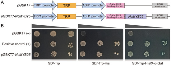 The transcriptional activation activity of the NcMYB25 transcription factor was analyzed using a yeast expression system [67]. The CDS of the NcMYB25 gene was cloned into the pGBKT7 vector to create the pGBKT7-NcMYB25 construct. This construct and pGBKT7 vector were transformed into Saccharomyces cerevisiae AH109 separately, and growth was tested on SD/–Trp and SD/–His/–Trp media. X-α-Gal (20 μg/mL) was added to SD/–His/–Trp media as an indicator of transcriptional activation activity. Primers used for transcriptional activation analysis assay are listed in Table S8.