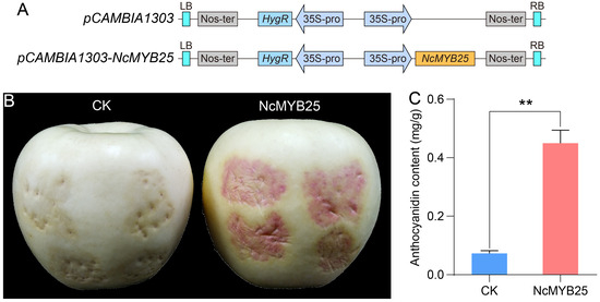 The apple pericarp transient transformation assay was performed following previously described methods [49]. The CDS of NcMYB25 gene was cloned into the pCAMBIA1303 vector to create the pCAMBIA1303-NcMYB25 construct. This construct, along with the pCAMBIA1303 vector, was transformed into A. tumefaciens GV3101 separately and injected into apple pericarps. The injected apples were placed in a dark incubator for 24 h, followed by 5 days in a lighted incubator. The apples inoculated with Agrobacterium containing the pCAMBIA1303-NcMYB25 vector and those inoculated with Agrobacterium containing the pCAMBIA1303 vector were maintained under identical environmental conditions. After this period, the color of the apple pericarp at the injection site was observed, and the anthocyanin concentration in the apple pericarp at the injection site was measured. The anthocyanin content in the pericarp was measured using the Anthocyanin Content Assay Kit (Biosharp Biotechnology Co., Ltd., Hefei, China). Primers used for apple pericarp transient transformation assay are listed in Table S9.