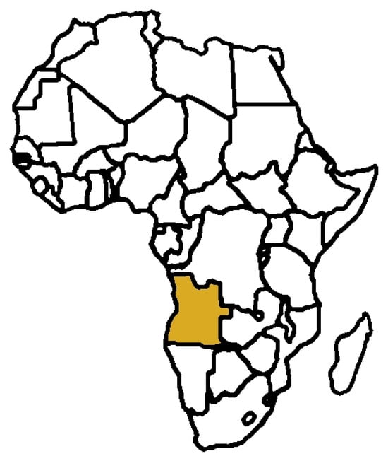 Angola’s geographic location in Africa (provided by Country Reports Org 2005 (https://www.countryreports.org/country/angola.htm), accessed on 4 March 2024).