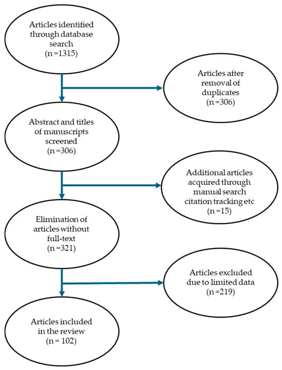 An overview of the procedure applied for the identification of 102 articles included in this review.