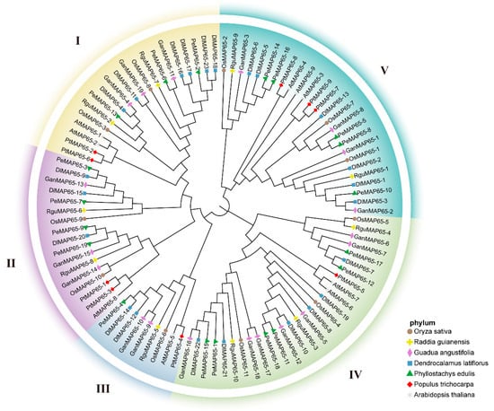 Phylogenetic tree of MAP65 gene family in seven species. Phylogenetic analysis of MAP65s across Phyllostachys edulis, Raddia guianensis, Dendrocalamus latiflorus, Guadua angustifolia, Oryza sativa, Populus trichocarpa, and Arabidopsis thaliana. Roman numerals I, II, III, IV, and V denote distinct gene clusters (groups). Variations in symbol shapes and colors represent different species.