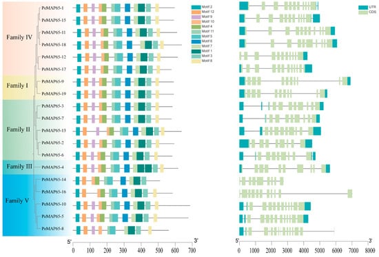 Conserved motifs and gene structure of PeMAP65s. The motif distribution of MAP65s (left). A total of 12 motifs are represented, each within differently colored boxes. Gene structures of PeMAP65s (right). The light green box represents the exon, the blue-green box represents the UTR, and the black line indicates the intron.