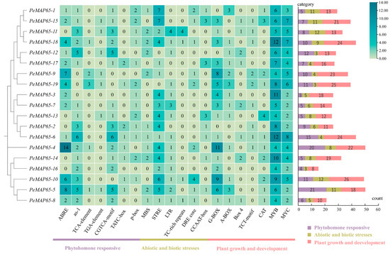 Cis-acting elements predicted in the promoter of PeMAP65s. All cis-acting elements were categorized into three categories. The heatmap demonstrates the number of cis-acting elements with the higher number in blue and the lower number in yellow. On the right, the number in the differently colored boxes represents the count of cis-acting elements in each category.