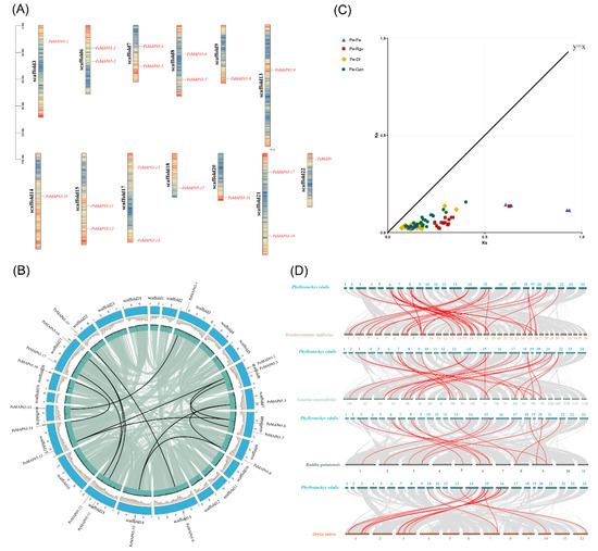 For analyzing scaffold distribution and syntenic relationships of PeMAP65s, the wyp1125/MCScanX software package was used. The Ka (non-synonymous substitution) to Ks (synonymous substitution) ratios were calculated. The syntelog analysis of PeMAP65s was performed according to the online database (https://bamboo.genobank.org/, accessed on 28 April 2024). The evolutionary time (T) was calculated using the Ks value with the formula: T = Ks/2λ, λ = 9.1 × 10−9 [46].