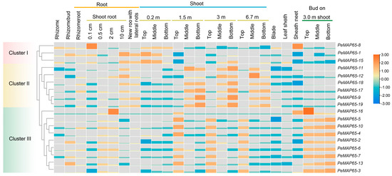 The expression patterns of PeMAP65s in 26 diverse tissues and developmental phases were analyzed according to RNA-seq data from moso bamboo (Figure 5). Except for PeMAP65-14, which was not expressed in any tissue, most PeMAP65s exhibited tissue specificity in their expression and were classified to three clusters. In cluster I, the expression levels of PeMAP65-1, PeMAP65-8, and PeMAP65-15 in the shoots at 0.2 m height were higher than those at greater heights. In cluster II, PeMAP65s were highly expressed in the middle and lower parts of the shoot, while PeMAP65s in cluster III were highly expressed in the upper parts of shoots and shoot buds.