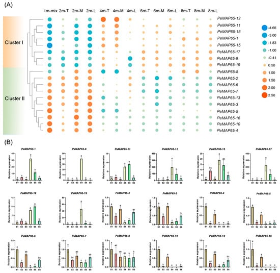 It could be found that PeMAP65s may be related to the growth and lignification process of bamboo shoots. Consequently, the expression of PeMAP65s was further characterized by investigating their expression profiles within the 13th internode of shoots at different heights. It can be clearly observed that the expression of PeMAP65s was mainly divided into two clusters (Figure 6A). Cluster I contained eight PeMAP65s, whose expression was upregulated along with the lignification process of bamboo shoots. However, the 10 PeMAP65s in cluster II showed opposite expression trends, mainly being highly expressed in 1 m and 2 m bamboo shoots. These results indicated that different PeMAP65 members played different roles in different developmental stages of bamboo shoots. The relative expression of PeMAP65s were validated by qRT-PCR (Figure 6B). During rapid bamboo growth, the degree of lignification varies across different internodes within the same bamboo shoot, as well as within different sections of the same internode. The samples used in qRT-PCR were ranked in terms of lignification degree from low to high, denoted as S1, S3, S2, S6, S5, and S4. The results revealed that these PeMAP65s exhibited similar expression patterns consistent with the findings of the transcriptome analysis.
