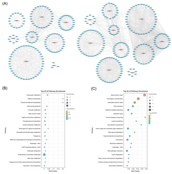 Co-expression networks of PeMAP65s. (A) Co-expression networks constructed by the database of co-expression networks with functional modules for moso bamboo. Red ellipses represent PeMAP65s, green ellipses represent the co-expressed genes with PeMAP65s, and gray lines represent the edges between these co-expressed genes. (B,C) KEGG functional enrichment on the genes co-expressed with PeMAP65s in two clusters based on the expression patterns of PeMAP65s in different lignified shoots.