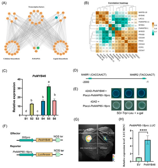 The transcriptional level of PeMAP65-18 was upregulated by PeMYB46. (A) A hierarchical gene regulatory network. At the top level, MYB46 (blue) is shown as a direct target of MAP65-18 (green). (B) The correlation heatmap of PeMAP65s with the genes related to SCW biosynthesis. The data represent the Pearson coefficient. (C) The relative expression level of PeMYB46 in different internodes. The different letters indicated significant differences, which the relative expression level between two samples was greater than or equal to 2. (D) Schematic diagram of MYB binding sites on the PeMAP65-18 promoter. (E) Y1H validation of the interaction between PeMYB46 and PeMAP65-18 promoter. (F) Schematic diagrams of the effector (PeMYB46) and reporter (PeMAP65-18pro) constructs were used in the dual-luciferase reporter assay. (G) An image of luciferase activity. (H) Relative luciferase activity was measured. Error bars represent SD. Statistical analysis was performed using the t test (n = 7, ****, p < 0.0001).