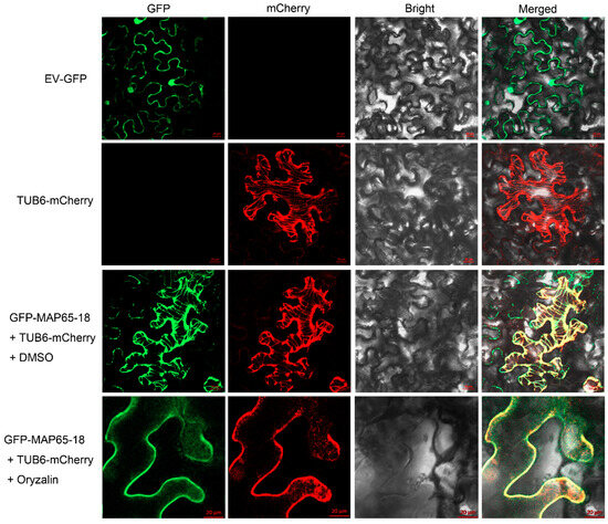 To detect the subcellular localization of PeMAP65-18, the 35S::eGFP-PeMAP65-18 vector was expressed in tobacco leaves. Through laser confocal microscopy observation, the fluorescence signal of eGFP-PeMAP65-18 showed a filamentous distribution, which was consistent with the signal of the microtubule localization marker AtTBU6-mCherry (Figure 9) and conformed to the distribution characteristics of cortical microtubules. Therefore, it was speculated that PeMAP65-18 was located in cortical microtubules. Further supporting this, the filamentous fluorescence signals of both eGFP-PeMAP65-18 and TUB6-mCherry were degraded following treatment with oryzalin, a microtubule depolymerizing agent, indicating that PeMAP65-18 is primarily associated with microtubules.