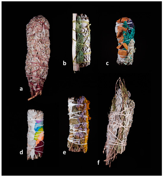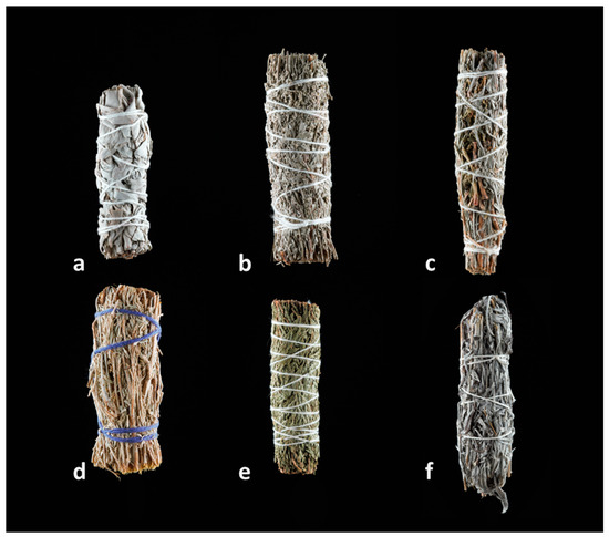 Collage of collected smudge sticks sourced from (online) shops in the Netherlands. (a) Salvia apiana; (b) Artemisia tridentata; (c) A. ludoviciana and Calocedrus decurrens; (d) A. tridentata; (e) Thuja sp.; (f) A. ludoviciana. Pictures by I. Pombo Geertsma and C. van der Linden.
