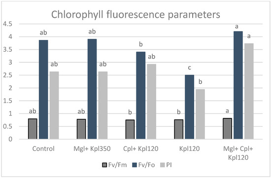 The maximum photochemical yield (Fv/Fm), the water splitting efficiency (Fv/Fo) of photosystem II (PSII), and the performance index (PI) of photosystem I (PSI) and PSII in Aronia leaves were increased in the fifth treatment (Mgl + Cpl + Kpl120) (by 2, 9, and 42% with respect to the first, respectively) (Figure 1). The lower values were recorded in the third (Cpl + Kpl120) and fourth (Kpl120) treatments. Additionally, PI was the highest for the fifth and the lowest for the fourth treatment.