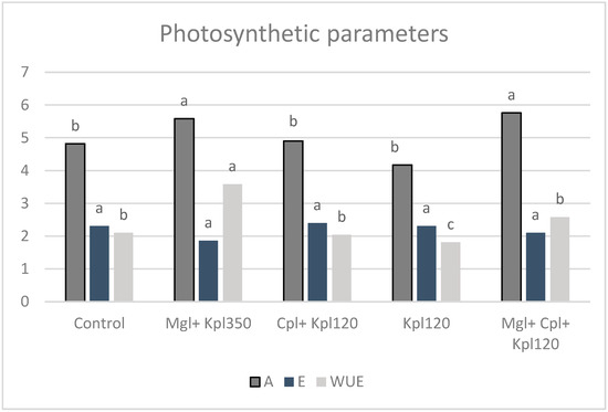 CO2 assimilation (A), transpiration (E), and water use capacity (WUE = A/E) changed under the action of the biostimulants, with a maximum WUE increase of 70% in the second treatment compared to the first (Figure 2). The application of Magnablue containing copper nanoparticles enhanced the photosynthetic activity and more efficient water use by the plants.