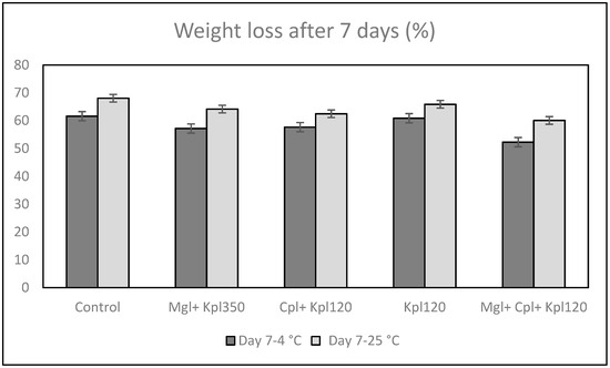 The weight loss rate is a crucial metric for evaluating fresh-cut fruit quality. After 7 days of fruit harvest and storage at 4 °C or 25 °C, significant fluctuations have been observed in the chokeberry biomass. Control fruits stored at 25 °C for 7 days revealed a significantly greater weight loss by about 68% on the first day of harvest. When exposed to the fifth treatment (Mgl + Cpl + Kpl120) and stored at 25 °C, the biomass loss was 60%. Notably, the storage at 4 °C and the cultivation with the fifth (Mgl + Cpl + Kpl120) treatment exhibited consistently lower weight loss rates (by about 10%) than the control and other biostimulant treatments (Figure 3). The use of the specific biostimulants, as well as the storage at 4 °C for 7 days, effectively delayed the weight loss of fresh-cut chokeberry fruits.