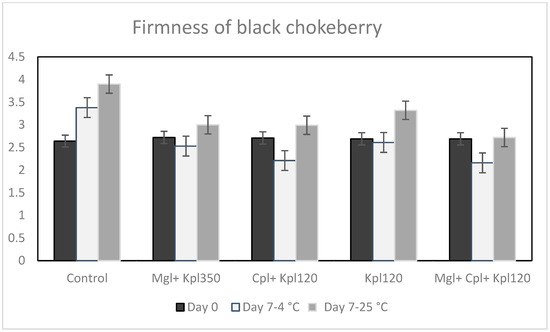 Exposure to different biostimulants contributes to maintaining the flesh texture of chokeberry fruits, which was similar to all treatments studied at day 0 (Figure 4). The storage at 4 °C and 25 °C for 7 days caused significant variation in fruit flesh resistance. The flesh resistance of the control fruits and fruits treated with the fourth treatment (Kpl120) were significantly reduced by 48% and 22% compared to day 0 after storage to 25 °C, respectively (Figure 4), since the higher force was needed to penetrate the fruit. In general, the use of biostimulants induced an increase in fruit integrity after 7 days of storage at 4 °C. The higher fruit flesh resistance has been shown on cultivation to the fifth treatment (Mgl + Cpl + Kpl120) by about 20% compared to the relevant value of day 0 (Figure 4). These results match those of the weight loss. It seems that the presence of certain biostimulants helps fruits maintain integrity and structure, while others lead to an acceleration of tissue aging, resulting in higher weight loss and firmness.