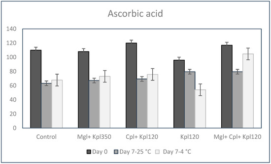 Fruits contain the highest amount of ascorbic acid (AA) when they are in their fresh activated state, while any processing handling tends to decrease the original content of this molecule. In our study, the highest amount of ascorbic acid was measured for all the treatments studied on day 0; more precisely, AA production increased along with the third (Cpl + Kpl120) and fifth (Mgl + Cpl + Kpl120) biostimulant applications by 10 and 7% compared to the untreated fruits, respectively (Figure 5). In fruits stored at 25 °C for 7 days, a significant loss of AA concentration was observed; under the fourth (Kpl120) treatment, a reduction of 53% on day 0 was measured. Storage at 4 °C caused maintenance of AA content, showing the smallest decrease after the fifth treatment of 10% of the day 0 value (Figure 5).
