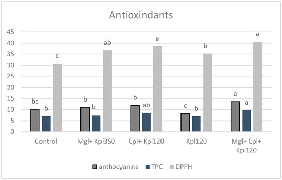 Anthocyanin content measured at day 0 in chokeberries was significantly affected by the application of biostimulants compared to the untreated fruits (Figure 6). The maximum value was detected after the fifth treatment (Mgl + Cpl + Kpl120) (by 33% of the control) and the lowest one after the fourth treatment. A similar trend was observed for the total phenolic content (TPC) in fruits, which showed the greatest values under the fifth treatment (Mgl + Cpl + Kpl120), which was 38% higher than the control. Biostimulants markedly enhanced the antioxidant capacity of the chokeberry fruits. All DPPH (1,1-diphenyl-2-picrylhydrazyl) values were higher than those of the untreated plants, giving the greatest values in the fifth treatment (Mgl + Cpl + Kpl120), by 32% of the control (Figure 6).