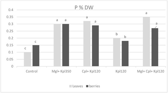 Phosphorus concentration (% dry weight) in leaves and berries for chokeberry plants after biostimulant treatment. Mean value, n = 3. Different letters for each parameter indicate significant differences according to Duncan’s multiple range test (p = 0.05).
