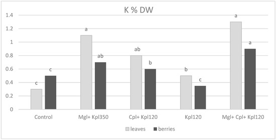 A trend of increasing potassium (K) content in both leaves and fruits was observed under the biostimulants. Cultivation under the second (Mgl + Kpl350) and fifth (Mgl + Cpl + Kpl120) treatments induces the major augmentation three-fold (40%) and four-fold (80%) for leaves and fruits, respectively (Figure 8). Potassium levels in leaves were notably higher than in berries across all treatments, with the control group having the lowest K concentrations. The fifth (Mgl + Cpl + Kpl120) treatment significantly increased potassium content in both leaves and berries, with the leaves showing a particularly dramatic increase.