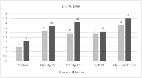 Calcium concentration (% dry weight) in leaves and berries for chokeberry plants after biostimulant treatment. Mean value, n = 3. Different letters for each parameter indicate significant differences according to Duncan’s multiple range test (p = 0.05).