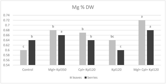 Magnesium concentration (% dry weight) in leaves and berries for chokeberry plants after biostimulant treatment. Mean value, n = 3. Different letters for each parameter indicate significant differences according to Duncan’s multiple range test (p = 0.05).