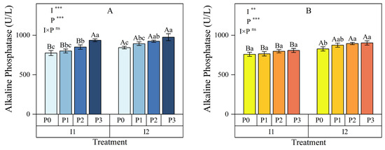 | Available Phosphorus (mg·kg−1) | I1 | P0 | 6.22 ± 0.64 Ac | 5.82 ± 1.33 Ad |