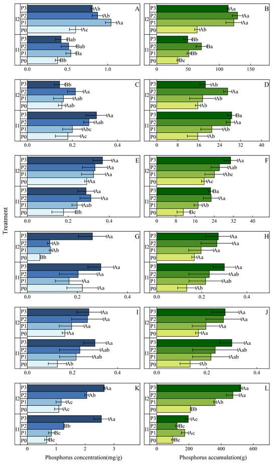 | Total Phosphorus (mg·kg−1) | I1 | P0 | 0.82 ± 0.06 Ac | 0.83 ± 0.11 Ab |
