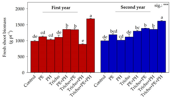Fresh shoot biomass as influenced by cultivation year and biostimulant interaction. Separation of Y × B interaction was performed using Tukey’s HSD test (p ≤ 0.05). ***: significant at p ≤ 0.001. First year: 2022–2023; second year: 2023–2024; Control: non −treated plants; PE: tropical plant extract; PH: legume-derived protein hydrolysate; Tricho: Trichoderma atroviride. Different letters indicate significantly different means. Bars indicate the standard error.