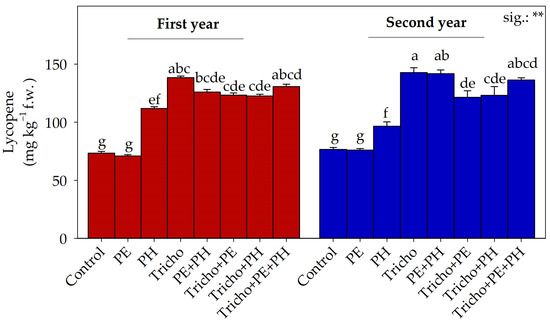 For lycopene, ANOVA evidenced a significant influence of Y × B interaction. The highest values were found in fruits from plants grown in the second year and supplied with Tricho, whereas the lowest values were observed in control or PE-treated plots cultivated during the first or second year (Figure 3).