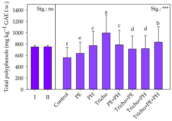 Total polyphenols as influenced by cultivation year and biostimulants. Separation of the mean biostimulant (B) effect was performed using Tukey’s HSD test (p ≤ 0.05) while the mean Y effect was compared using the t-test. ***: significant at p ≤ 0.001. First year: 2022–2023; second year: 2023–2024; Control: non-treated plants; PE: tropical plant extract; PH: legume-derived protein hydrolysate; Tricho: Trichoderma atroviride. Bars indicate the standard error. Different letters indicate significantly different means.