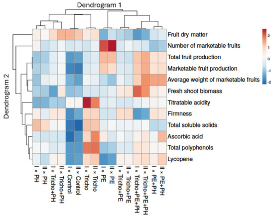 For fruit dry matter, values similar to the control were detected in Tricho + PH and Tricho treatments. Regarding the number of marketable fruits, all treatments showed similar values to the control, with the exception of PE treatment. Contrariwise, for total fruit production, marketable fruit production, and the average weight of marketable fruits, all treatments revealed dissimilar values compared with the control, excluding PH treatment. For fresh shoot biomass, PH, Tricho, and PE treatments had similar values compared to the control. Moreover, for titratable acidity and firmness, the heat-map analysis revealed that Tricho + PE + PH showed analogous values to the control. However, for firmness, PE + PH treatment also had values comparable to the control. The treatment PE + PH—for total soluble solids—gave similar values to the control, whereas, for ascorbic acid, the heat-map detected that all treatments were different from the control. Lastly, for total polyphenols and lycopene, data similar to the control were detected in PE treatment.