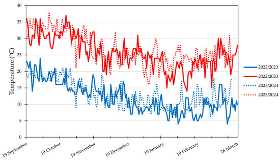 Minimum (blue color) and maximum (red color) temperatures recorded during the 2022–2023 and 2023–2024 growing cycles (from 19 September to 26 March) in the experimental greenhouse.
