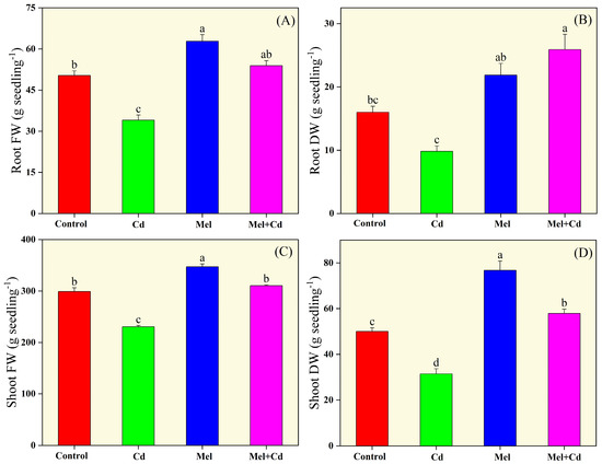 Effects of soil application of melatonin (Mel) on root fresh weight (FW; (A)), root dry weight (DW; (B)), shoot fresh weight (C) and shoot dry weight (D) of tobacco under cadmium (Cd) stress. The values of each parameter are means ± SE of three replicates. Similar letters show non-significant difference among the treatments according to LSD test (p < 0.05).