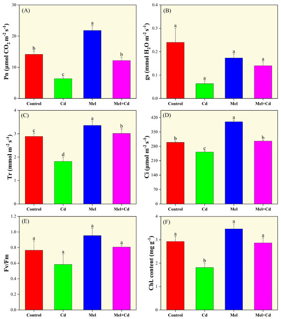 Effects of soil application of melatonin (Mel) on photosynthesis (Pn; (A)), stomatal conductance (gs; (B)), transpiration rate (Tr; (C)), intracellular CO2 concentration (Ci; (D)), chlorophyll florescence (Fv/Fm; (E)) and chlorophyll content (F) in tobacco seedlings under cadmium (Cd) stress. The values of each parameter are means ± SE of three replicates. Similar letters show non-significant difference among treatments according to LSD test (p < 0.05).