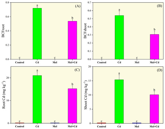 Effects of soil application of melatonin (Mel) on bioconcentration factor of root (BCFroot; (A)) and shoot (BCFshoot; (B)), cadmium (Cd) concentration in root (C) and shoot (D) of tobacco seedling under Cd stress. The values of each parameter are means ± SE of three replicates. Similar letters show non-significant differences among treatments according to LSD test (p < 0.05).