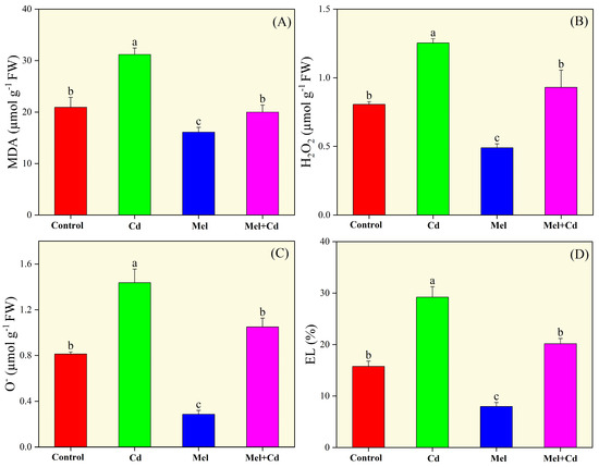 Compared with the control and melatonin groups, sole Cd supplementation substantially increased MDA, H2O2, O2•− contents and EL in shoots (Figure 4). However, melatonin application significantly decreased these values, especially when applied alone or under Cd stress conditions. In Cd-treated plants, melatonin supplementation decreased MDA, H2O2 and O2•− contents and EL by 35.87%, 25.79%, 26.91% and 30.93%, respectively, compared with the Cd-only group. The effectiveness of our treatments in reducing these indices ranked as follows: melatonin < melatonin + Cd < control < Cd.