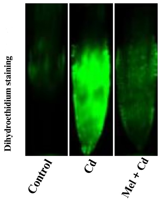 Tobacco leaves stained using dihydroethidium dye for O2•− under control, cadmium (Cd), and melatonin (Mel) + Cd conditions.