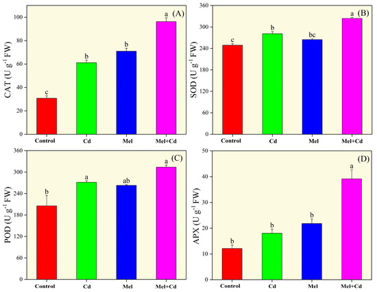 Effects of soil application of melatonin (Mel) on catalase (CAT; (A)), superoxide dismutase (SOD; (B)), peroxidase (POD; (C)), and ascorbate peroxidase (APX; (D)) in tobacco seedling under cadmium (Cd) stress. The values of each parameter are means ± SE of three replicates. Similar letters show non-significant difference among treatments according to LSD test (p < 0.05).