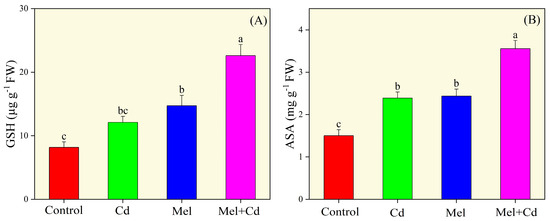 Effects of soil application of melatonin (Mel) on glutathione (GSH; (A)) and ascorbic acid (AsA; (B)) content in tobacco seedlings under cadmium (Cd) stress. The values of each parameter are means ± SE of three replicates. Similar letters show non-significant differences among treatments according to LSD test (p < 0.05).