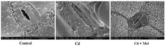 Cd accumulation in above-ground plant parts can damage the leaf epidermis and stomata (Figure 8). SEM analysis was performed to analyze the influence of melatonin supplementation on guard cells and stomatal aperture. Recognizable effects were observed on the leaf epidermis, with melatonin application prominently affecting guard cell structure and stomatal aperture (Figure 8). Cd ion accumulation significantly reduced stomatal opening, with most stomata undergoing complete closure due to plasmolysis of the stomatal cells.