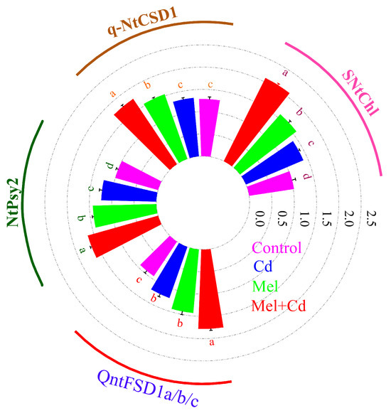 Effect of soil applied melatonin (Mel) on the expressions of various genes in tobacco leaves under cadmium (Cd) stress.