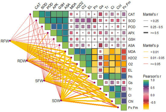 A mantel correlation was performed to analyze relationships among the recorded parameters. As shown in Figure 10, seedling fresh and dry weights were positively correlated with photosynthesis, chlorophyll content and fluorescence. These growth indices also demonstrated a strong positive association with both enzymatic and non-enzymatic antioxidants. Leaf gas exchange indices, such as Pn, gs, Tr and Ci, were positively correlated with growth traits. Growth traits were strongly and positively associated with antioxidant enzyme activities but negatively associated with ROS and MDA content. Leaf gas exchange traits and chlorophyll fluorescence demonstrated a strong negative association with stress indicators.