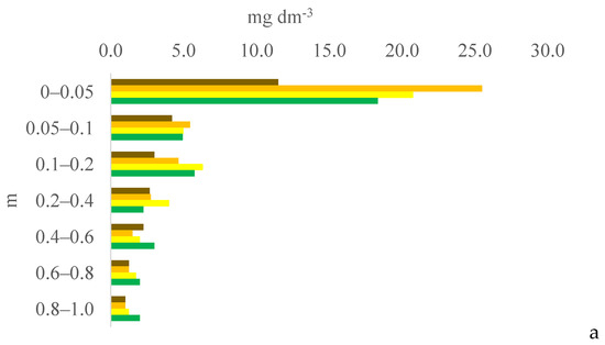 Among the sampled soil depths, the soil P content was highest in the surface layer (0–0.05 m) regardless of the percentage of thinning or the distance from the eucalyptus line. The soil in the experimental area has not been tilled since the 2009–10 season, promoting nutrient accumulation in the surface layers [14].