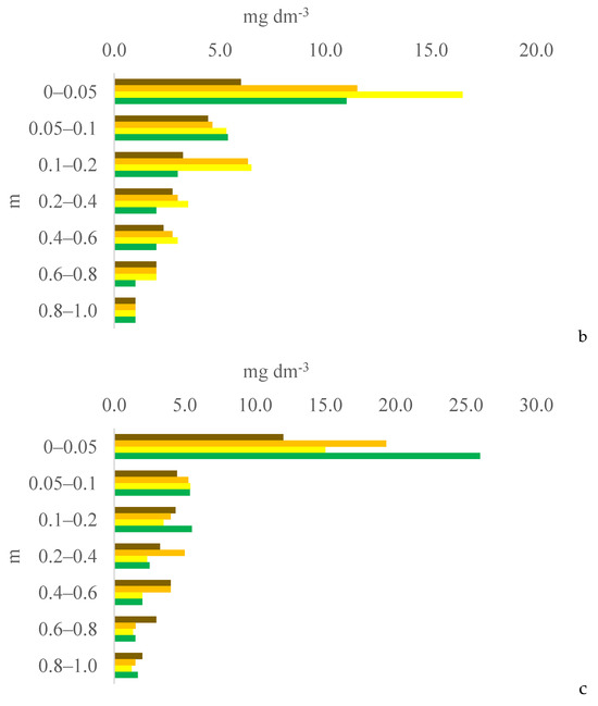 Interaction between eucalyptus thinning of 0% (a), 50% (b), or 100% (c) and sampling position relative to the eucalyptus line: 0 m (brown); 2.0 m (orange); 4.0 m (yellow); and 6.0 m (green) for soil P content at depths of 0–0.05, 0.05–0.1, 0.1–0.2, 0.2–0.4, 0.4–0.6, 0.6–0.8, and 0.8–1.0 m.
