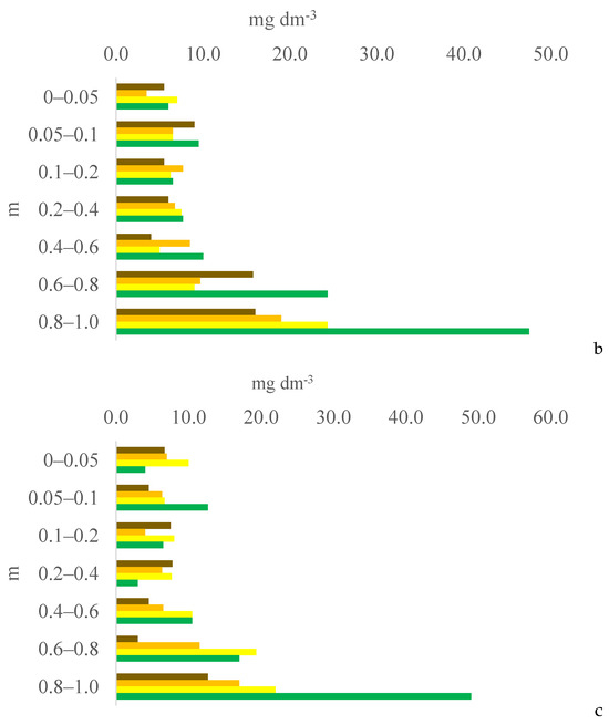 Interaction between eucalyptus thinning of 0% (a), 50% (b), or 100% (c) and sampling position relative to the eucalyptus line: 0 m (brown); 2.0 m (orange); 4.0 m (yellow); and 6.0 m (green) for soil K+ content at depths of 0–0.05, 0.05–0.1, 0.1–0.2, 0.2–0.4, 0.4–0.6, 0.6–0.8, and 0.8–1.0 m.