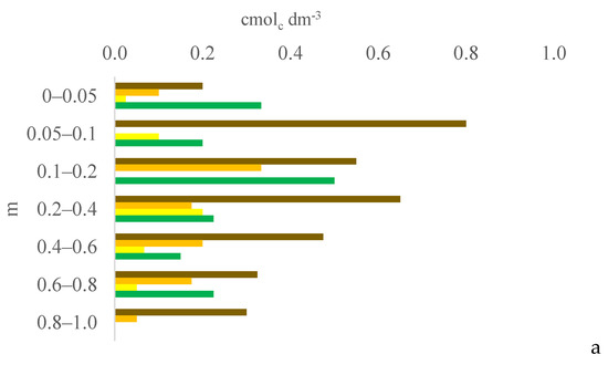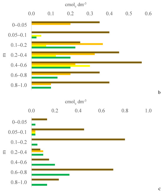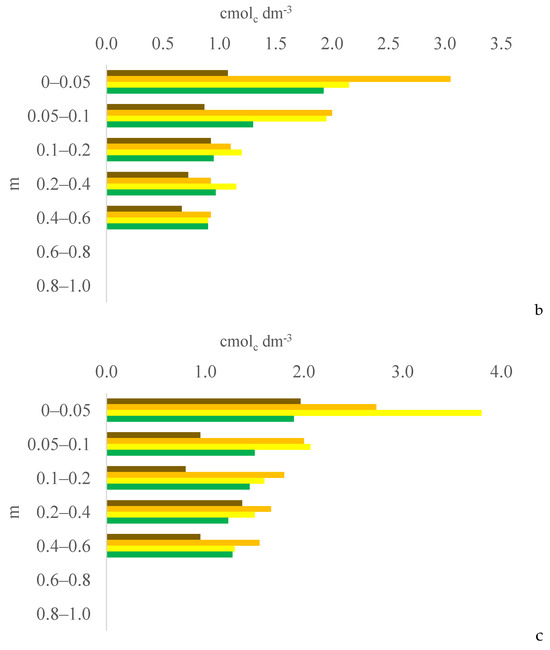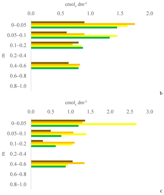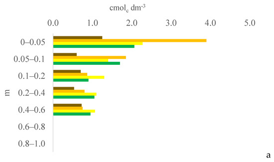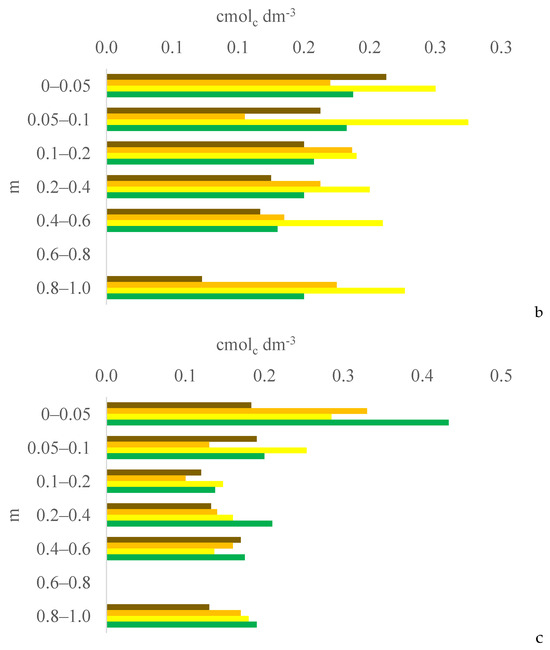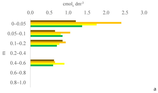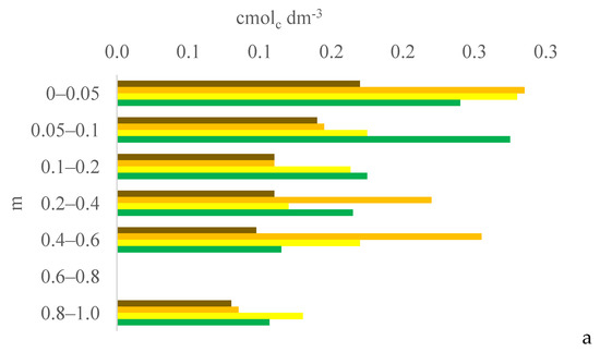 The lower pH at 0 m increased the Al3+ content at this distance from the eucalyptus line compared with distances of 2.0, 4.0, and 6.0 m. These increases occurred in both the surface and subsurface layers in the 0%, 50%, and 100% treatments (0–0.2 and 0.6–1.0 m in 0%; 0.05–0.1, 0.2–0.6, and 0.8–1.0 m in 50%; and 0–0.1 and 0.6–1.0 m in 100%). According to [42], the concentration of Al3+ in the soil solution increases with soil acidity. At a low pH, H+ acts on minerals to release Al3+, which is predominantly retained by negatively charged clay particles in the soil in equilibrium with Al3+ in the soil solution [22]. By contrast, in soils with pH >5.5, Al is found in precipitated forms [42,43].