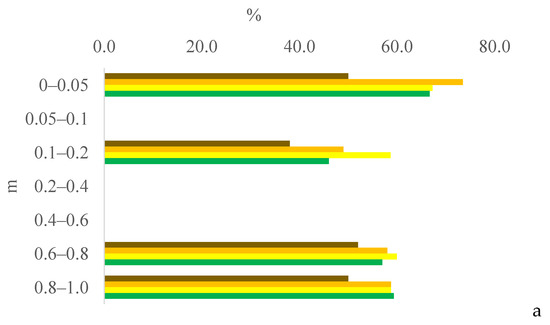 Interaction between eucalyptus thinning of 0% (a), 50% (b), or 100% (c) and sampling position relative to the eucalyptus line: 0 m (brown); 2.0 m (orange); 4.0 m (yellow); and 6.0 m (green) for soil pH at depths of 0–0.05, 0.05–0.1, 0.1–0.2, 0.2–0.4, 0.4–0.6, 0.6–0.8, and 0.8–1.0 m.