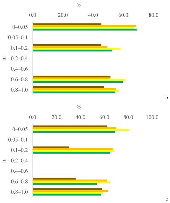 Interaction between eucalyptus thinning of 0% (a), 50% (b), or 100% (c) and sampling position relative to the eucalyptus line: 0 m (brown); 2.0 m (orange); 4.0 m (yellow); and 6.0 m (green) for soil BS at depths of 0–0.05, 0.05–0.1, 0.1–0.2, 0.2–0.4, 0.4–0.6, 0.6–0.8, and 0.8–1.0 m.