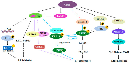 Auxin plays a crucial role in regulating lateral root development. A key component of this signaling pathway is the auxin-responsive factors (ARFs)–lateral organ boundaries–domain transcription factors (LBDs) complex, which regulates almost all stages of lateral root development [17]. It is believed that LBD proteins regulate the transcription of downstream genes in the form of homodimers or heterodimers. Recent studies have identified two MYB transcription factors, MYB2 and MYB108, that interact with LBD29. Both of these factors are induced by auxin in an ARF7-dependent manner. Additionally, the MYB2-LBD29 and MYB108-LBD29 complexes promote the expression of cuticle destructing factor 1, a member of the Gly-Asp-Ser-Leu (GDSL) lipase/esterase family involved in LR development [62]. Furthermore, auxin is thought to regulate lateral root development by activating the TMK-MKK4/5-MPK3/6 signaling pathway, which controls the pattern of cell division [63,64]. Research has shown that TMK1 can phosphorylate the VIK protein kinase in response to auxin, and VIK, in turn, regulates lateral root development by phosphorylating ERF13 and LBD18 and cooperates with MPK14 to promote the degradation of ERF13, thereby facilitating lateral root formation. Moreover, VIK and ERF13 form a positive feedback loop that plays a critical role in controlling lateral root development [65]. Studies have found that auxin (1-naphthaleneacetic acid, NAA) can activate not only MPK14 but also MPK1 and MPK2, even in the presence of the auxin receptor transport inhibitor response 1 (TIR1) inhibitor PEO-IAA [66,67]. New research suggests that auxin promotes the synthesis of very long-chain fatty acids (VLCFAs) by activating MPK14 kinase activity, which then phosphorylates ERF13. Phosphorylated ERF13 is degraded by the 26S proteasome, allowing for the expression of downstream KCS16 genes, which promotes the synthesis of VLCFAs. VLCFAs further influence the degradation of pectin in cortical cell walls at the lateral root primordium, affecting the transition from stage IV to stage V of lateral root primordium development, thus impacting lateral root development [68]. Further studies have investigated how ERF13 is degraded. By examining ERF13 interacting proteins (IP-MS), researchers successfully identified the ubiquitin ligases MAC3A/3B as ERF13 interaction partners [69]. A detailed molecular mechanism analysis revealed that although MAC3A/3B can ubiquitinate and degrade ERF13, it requires the following prerequisite condition: MPK14-mediated phosphorylation of ERF13 in response to auxin signaling. Further research confirmed that MPK14-mediated phosphorylation of ERF13 is a crucial signal for enhancing the recruitment of MAC3A/3B and leading to its degradation. Moreover, the study found that auxin not only promotes the transcription of MAC3A/3B but also significantly enhances the stability of MAC3A/3B proteins, thereby synergistically promoting the accumulation of MAC3A/3B proteins during lateral root development and the rapid clearance of ERF13 [15] (Figure 2).